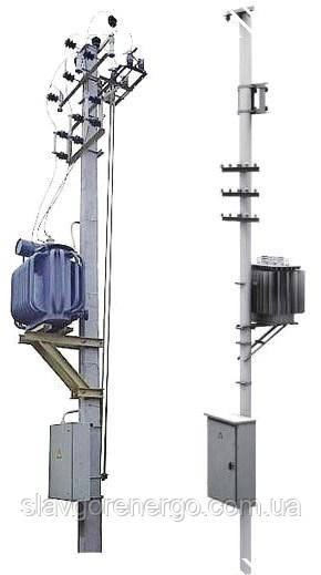 КТПС складається з таких частин: низьковольтної шафи (РУНН), силового трансформатора оливного або сухого, високовольтних запобіжників — ПКТ, розрядників — РВО або ОПНП. Складники КТПС розміщуються на опорі LEP. Дроти, що виходять із шафи РУН слугують для приєднання до повітряних ліній НН і до силового трансформатора з боку НН, прокладаються зазвичай у трубах, які закріплені на опорі.